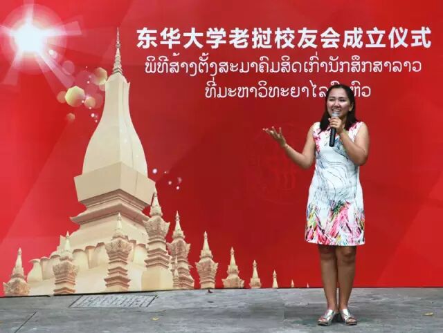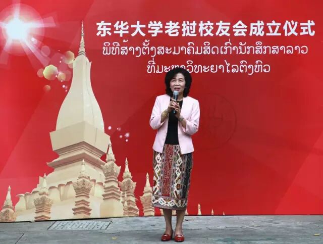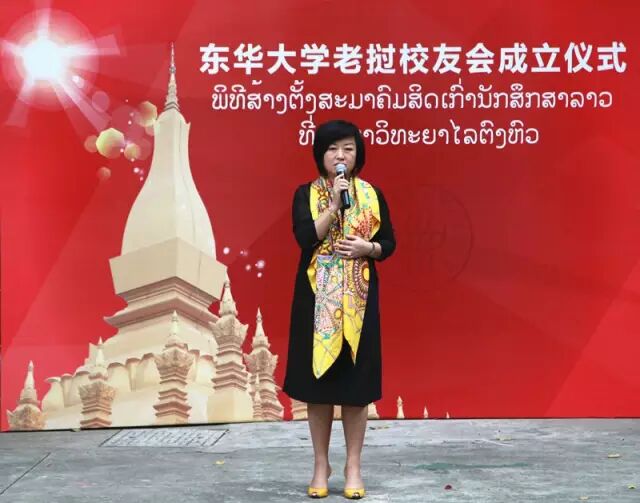 西沙美女士致辞,感谢东华大学对老挝留学生一直以来的关心,并对东华大学老挝校友会的成立表示热烈的祝贺,希望老挝校友会成为两国交流的一座桥梁!